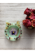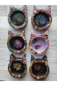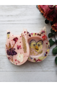 Each trinket dish will be one of a kind creation made with random selected botanicals such as mini rosebuds in yellow red, pink. forget me nots, statice, babys breath, cedar, juniper, mums but not limited to what I have in my stash. I will be using a mix of whatever I can fit inside. It will be accented with Gold or silver leaf and various glitters.